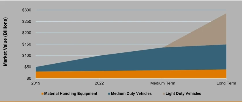 Statt nur 100, könnten also langfristig theoretisch alle 97.000 Fahrzeuge der DHL Group weltweit, davon sind 67.000 Transporter für die neue Technologie in Frage kommen. Eine neue Grafik von Plug Power zeigt: Nachdem sich der Absatzmarkt für den US-Brennstoffzellenhersteller mal eben verdoppelt, rechnet man damit, dass bald auch Autos (Light Duty Vehicles) ausgerüstet werden könnten.