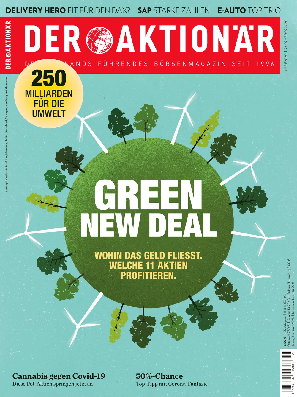 Unternehmen, die in den Sektoren erneuerbare Energie, Wasserstoff, Batterietechnologie oder E-Mobilität zu Hause sind, werden auf alle Fälle von dem Geldsegen profitieren. Welche weiteren Branchen der Green Deal zu einem Wachstumsschub verhelfen kann und mit welchen 11 Aktien sich Anleger erfolgreich einklinken können, steht in der neuen Ausgabe des AKTIONÄR.