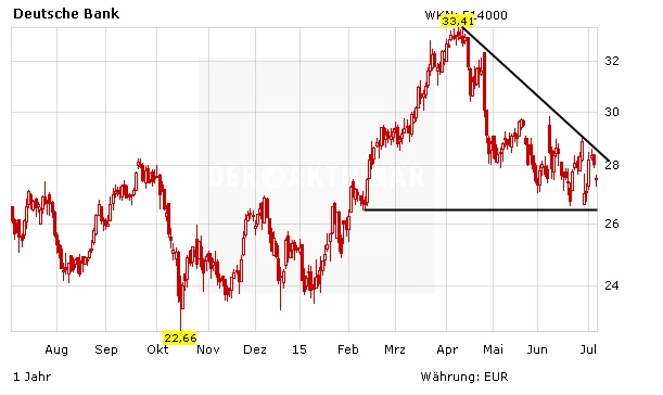 Sobald Klarheit im Griechenland-Drama herrscht, sollte es schnell wieder aufwärts gehen mit den Aktien der Deutschen Bank und der Commerzbank. Der faire Wert der Deutschen Bank liegt bei 40 Euro, der der Commerzbank bei 14 Euro. Der Stoppkurs sollte bei 24,50 Euro beziehungsweise bei 10,80 Euro gesetzt werden.