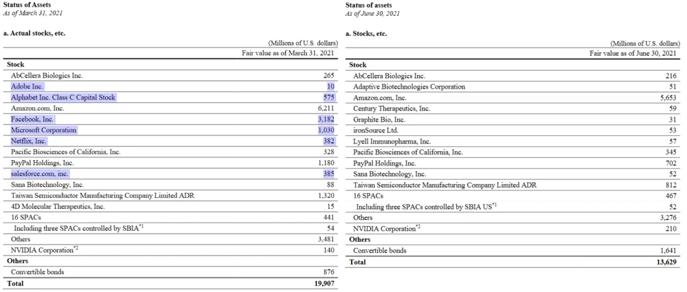 Bekannt für ihre beiden milliardenschweren Vision-Fonds verfügt die Softbank auch über eine Trading-Tochter namens Softbank Northstar. Die unterschiedlichen Aktienpositionen der Tochter werden im Quartalsbericht aufgelistet und lassen sich daher gut nachverfolgen.