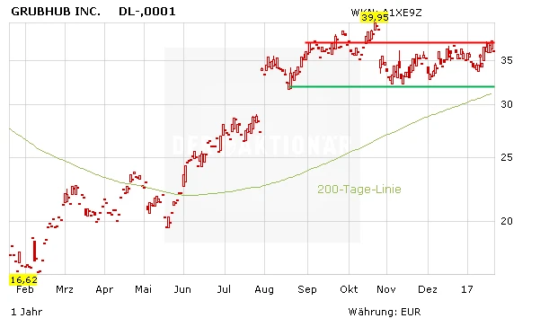 Die Grubhub-Aktie tat sich zum Jahresbeginn schwer: Zwar konnte das Upgrade von Morgan Stanley auf Overweight den Kurs etwas beflügeln – dennoch prallte der Chart am Widerstand im Bereich von 39 Dollar ab. Ein starkes viertes Quartal könnte der Aktie den entscheidenden Impuls geben, um die Range zwischen der Unterstützung bei 35,50 und dem Widerstand zu verlassen. DER AKTIONÄR bleibt bullish: Kursziel 45 Euro.