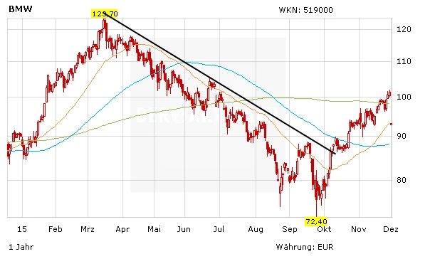 Sollte die Prognose eintreffen, so würden allen voran die deutschen Autobauer davon profitieren. Für die war es ohnehin ein sehr schwieriges Jahr. Die Daimler-Aktie ist nach dem Schwächeanfall am deutschen Aktienmarkt etwas unter die Räder gekommen. Die aktuellen Kurse bieten sich zum Einsteig oder zum Ausbau der Position an. Gut möglich, dass 2016 neue Pläne der Bundesregierung bezüglich der Elektromobilität vorgelegt werden. Spätestens dann wird es im Autosektor zu einem Favoritenwechsel kommen. Die Börse wird dann die BMW-Karte spielen.