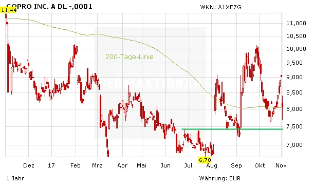 Die Quartalszahlen von GoPro sind besser als erwartet. Der Umsatz kletterte im dritten Quartal auf 330 Millionen US-Dollar (Schätzung: 314) und der Gewinn je Aktie auf 0,15 US-Dollar (Schätzung: 0,02). Trotzdem fiel die Aktie. Grund waren die Prognosen für das Schlussquartal. Hier wurden die die Schätzungen weit verfehlt. GoPro passte die Erlöserwartungen zwar nach oben auf 480 Millionen US-Dollar an, jedoch rechneten Analysten mit 521 Millionen US-Dollar. Die Befürchtungen vieler Anleger, der Actioncam-Produzent könne sich nach dem fürchterlichen Jahre 2016 nicht wieder regenerieren, werden dadurch weiter bestärkt.