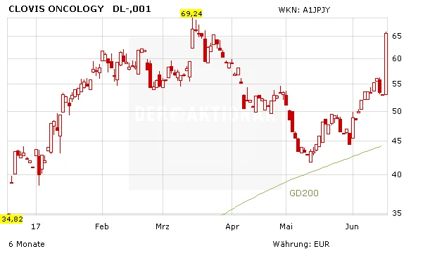 Auf dem gleichen Forschungsfeld wie Clovis ist auch Tesaro unterwegs. Die Aktie des Konkurrenten geht nach den starken Studienergebnissen von Clovis deutlich in die Knie. Tesaro ist derzeit Beteiligung von BB Biotech, von Clovis hatten sich die Schweizer vor einiger Zeit getrennt. Beide Unternehmen werden seit Längerem auch als Übernahmekandidat gehandelt. Ein potenzieller Interessent könnten nun möglicherweise Clovis den Vorzug geben.