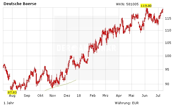 Seit Jahresbeginn hat die Aktie der Deutschen Börse über 17 Prozent an Wert zugelegt. Für den DAX steht in diesem Zeitraum ein Minus von rund sechs Prozent zu Buche. In den vergangenen vier Jahren hat der Börsenbetreiber seinen Wert sogar mehr als verdoppelt. Im September 2014 startete die Aktie der Deutschen Börse eine dynamische Aufwärtsbewegung. Ausgehend von der 50-Euro-Marke kletterte der Kurs bis ins Frühjahr 2015 um 30 Prozent auf über 80 Euro. Im Anschluss folgte eine mehrmonatige Konsolidierungsbewegung in einer Range zwischen 70 und 87,28 Euro. Diese endete im November 2016 mit einem Kursrutsch auf 66,20 Euro.