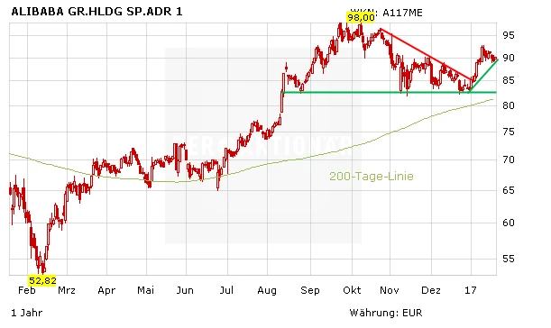 Fürs Gesamtjahr 2017 erwarten Analysten ein Umsatzwachstum von 31 Prozent auf 29 Milliarden Dollar. Ebenso positiv wird die Entwicklung des operativen Ergebnisses eingeschätzt – dieses soll um 31 Prozent auf 7,8 Milliarden Dollar ansteigen. Der AKTIONÄR empfiehlt auch 2017 die mit einem 17er KGV von 23 bewertete Alibaba-Aktie zu kaufen. Hinweis: Alibaba veröffentlicht am 24. Januar Quartalszahlen – DER AKTIONÄR wird berichten.