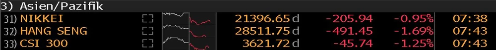 Die neuen Aussagen Trumps wirken sich belastend auf die asiaitischen Börsen aus. Der japanische Leitindex Nikkei büßt knapp ein Prozent ein, der Hang Seng und CSI 300 sogar deutlich mehr.