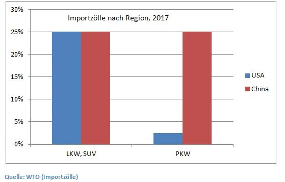 Der VW-Konzern hat im US-Werk in Chattanooga im Jahr 2017 gut 140.000 Autos gebaut (VW Passat und VW Atlas). Diese werden jedoch nicht nach China exportiert, sondern vor allem nach Kanada, Mexiko, den Nahen Osten und Südkorea. Audi und Porsche werden in den USA nicht gebaut. Insgesamt verkaufte der VW-Konzern in China knapp 4.184.000 Fahrzeuge. VW plant in China bald ein weiteres Werk zu öffnen.