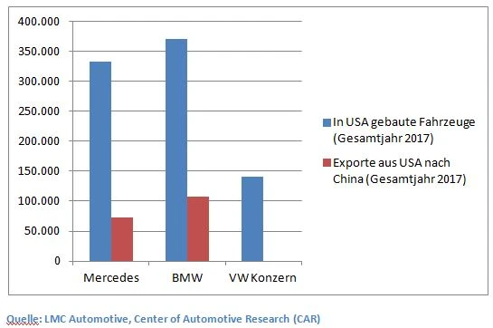Im Jahr 2017 wurden in den US-Werken deutscher Automobilhersteller etwa 844.000 Fahrzeuge gebaut. Davon wurde weniger als die Hälfte in den USA verkauft. Der Rest, etwa 481.000, wurde exportiert. Nach China wurden insgesamt 266.657 der in den USA produzierten Autos exportiert, davon allein knapp 67 Prozent von deutschen Herstellern.