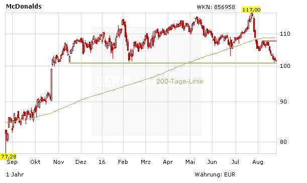 Trotz der fundamentalen Probleme bleibt McDonald's eine wahre Dividendenperle für Anleger. Für den AKTIONÄR ist die Aktie mit einer Dividendenrendite von drei Prozent ein Basisinvestment im Depot. Die Papiere sind von ihrem Allzeithoch von Mitte Mai bei 131,96 Dollar etwas zurückgekommen. Die Rücksetzer können als Einstieg genutzt werden.