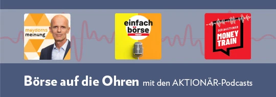 Ob auf dem Laufband beim Joggen, im Auto auf dem Weg zur Arbeit oder während des Hausputzes: Podcasts passen sich an Ihr Leben an. Das Podcast-Angebot von DER AKTIONÄR liefert Ihnen die wichtigsten Informationen und Storys rund um Börse, Aktien und Investments. Aber hören Sie doch selbst rein und holen Sie sich Ihr Börsenwissen einfach und bequem per Tablet oder Smartphone bei „Money Train“, „einfach börse“ oder „Maydorns Meinung“.