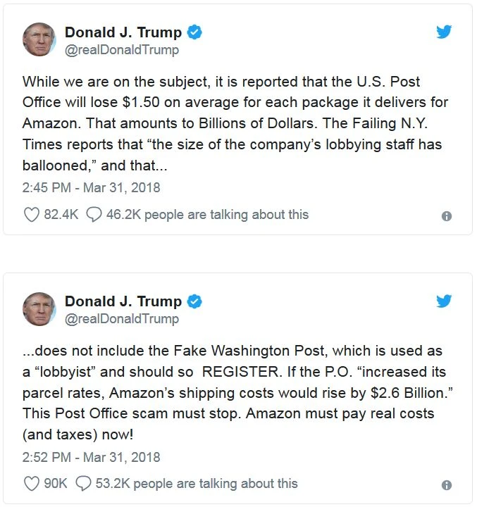Während der Fake-News-Aufschrei des Präsidenten eher lächerlich erscheint und folgenlos bleiben dürfte, gestaltet sich die Beziehung des Online-Händlers zum USPS komplizierter. Nachdem Trump vergangenen Donnerstag ankündigte, eine unabhängige Sonderprüfung des USPS durchzuführen, besteht nun die Sorge, dass dies wirtschaftliche Folgen für Amazon haben könnte.
