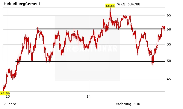 Die Strategie von HeidelbergCement mit der Konzentration auf die Schwellenländer und die Erholung in den Industrienationen macht sich zunehmend positiv bemerkbar. Hält sich der Kurs nun nachhaltig über der wichtigen 60-Euro-Marke, sind nach zwei Jahren der Seitwärtsbewegung weitere Kursgewinne zu erwarten. Das Mehrjahreshoch bei gut 68 Euro ist dann das nächste Etappenziel.