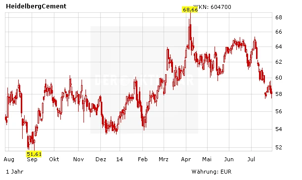 DE AKTIONÄR hat HeidelbergCement wegen der Ausrichtung auf die Schwellenländer und der Erholung in den Industrienationen auf seiner Empfehlungsliste. Zuletzt sorgte jedoch der schwache Gesamtmarkt für eine enttäuschende Entwicklung der Aktie. Der Stopp bei 52 Euro sollte nicht unterschritten werden.