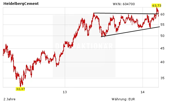 Fundamental steht der Zementanbieter ebenfalls weiterhin gut dar. Obwohl die Ergebnisprognosen des Konzerns zu optimistisch erscheinen, hebt Analyst Robert Muir von der Berenberg-Bank das Kursziel für die Aktie von 63 auf 67 Euro an. Gleichzeitig stuft er den Titel jedoch von „Buy“ auf „Hold“ ab. HeidelbergCement bleibt für den Experten zwar der beste Wert in der Branche, das Aufwärtspotenzial sei aber inzwischen begrenzt.