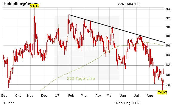 Die enttäuschenden Halbjahreszahlen seien mittlerweile mehr als eingepreist, so Analyst Josep Pujal von Kepler Cheuvreux. Doch nun sei die Aktie wieder attraktiv. Der Wirbelsturm „Harvey“ sowie die Strafe der italienischen Kartellbehörden gegen die Tochter Italcementi – beide Nachrichten hatten zuletzt auf den Kurs gedrückt – hält er für vernachlässigbar. Das einzige wirkliche Problem sei der starke Euro, da HeidelbergCement ein Viertel des operativen Gewinns in den USA erwirtschafte, so Pujal.