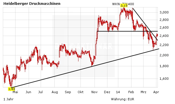 Die Heideldruck-Aktie ist zuletzt deutlich unter Druck geraten. Seit dem Zwischentief bei 2,10 Euro hat der Druckmaschinenhersteller inzwischen zwar bereits wieder über zehn Prozent zugelegt, dennoch notiert die Aktie noch deutlich unterhalb des 52-Wochen-Hochs bei 3,16 Euro. Die Analysten sehen auf dem aktuellen Niveau rund 30 Prozent Potenzial.