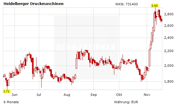 Die DZ Bank hat die Einstufung für Heidelberger Druck nach einer Investorenveranstaltung auf „Kaufen“ mit einem fairen Wert von 3,20 Euro belassen. Der Druckmaschinenbauer dürfte die mittelfristig angestrebten Margenziele im Geschäftsjahr 2015/16 erreichen, schrieb Analyst Jasko Terzic in einer Studie. Mit Blick auf die Umsatzentwicklung sieht Terzic im Dienstleistungsbereich sowie im Digitaldrucker-Geschäft Potenzial.