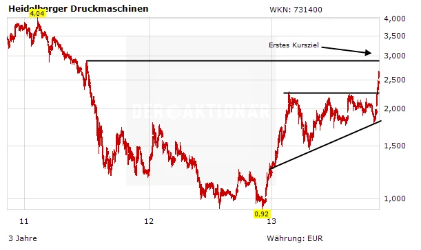Noch einen Schritt weiter ging die Deutsche Bank. Sie sieht das Kursziel bei 4,00 Euro. Der Druckmaschinenhersteller habe die Kurve gekriegt und sei nun auf dem Erholungspfad, schrieb Analyst Peter Reilly in einer Studie vom Montag. Die Zielerhöhung begründete er mit seiner wachsenden Zuversicht in die Zukunft des Unternehmens.