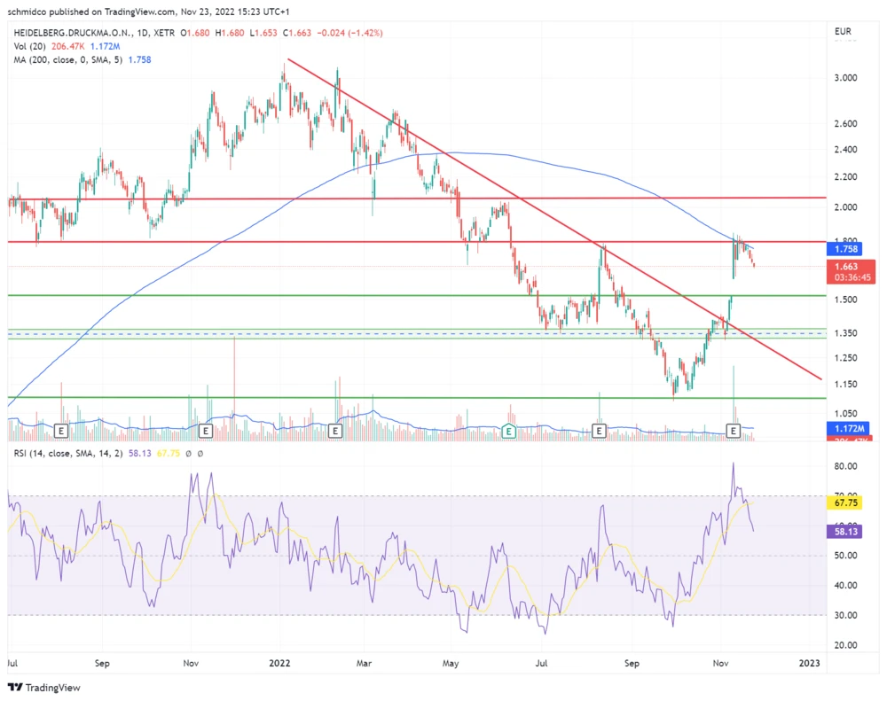 Von der Heidelberger-Druck-Aktie kamen zuletzt wieder positive Neuigkeiten. So generierte der Titel seit Längerem wieder ein Kaufsignal, als er die Abwärtstrendlinie durchbrochen hat. Zudem sorgten die Geschäftszahlen für ein Kursfeuerwerk. Damit sich das Chartbild weiter aufhellt, muss die Aktie jetzt diese Marke bezwingen.