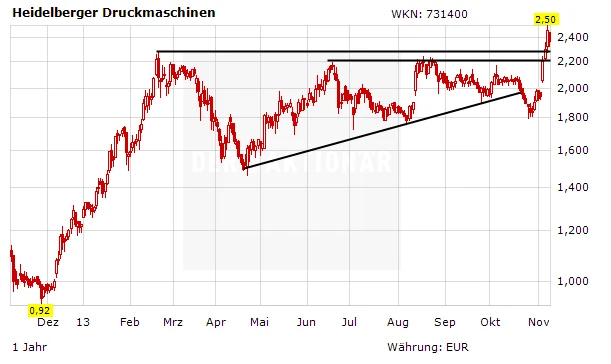 Angesichts des rasanten Anstiegs ist es nicht verwunderlich, dass Gewinnmitnahmen die Aktie kurzfristig belasten. Und auch aus charttechnischer Sicht ist eine Verschnaufpause durchaus begrüßenswert. Doch gerade der Chart spricht eindeutig für eine Fortsetzung der Rallye. Durch den Ausbruch über 2,28 Euro hat der Chart ein starkes Kaufsignal generiert ¿ das fundamental auch durch einen guten Newsflow untermauert ist. Die Zahlen sind durchaus zufriedenstellend ausgefallen, das Management hat weiter die Gewinnzone im Visier und die neue Kooperation im Digitaldruck-Bereich macht ebenfalls Mut.