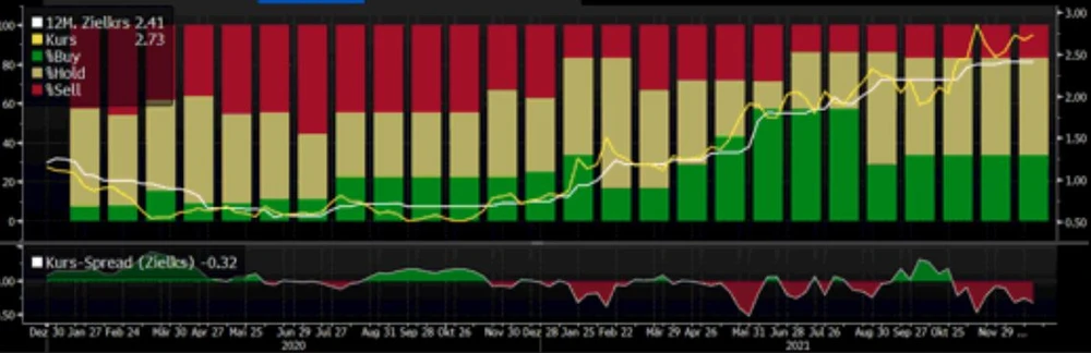 Sechs Analysten beschäftigen sich laut Bloomberg derzeit regelmäßig mit Heidelberger Druck. Das Bild ist dabei sehr gemischt. Drei raten zum Kauf, dem steht eine Verkaufsempfehlung gegenüber. Zwei Mal lautet das Votum zudem „Halten“. Allerdings liegt das durchschnittliche Ziel von 2,41 Euro rund zwölf Prozent unter dem aktuellen Niveau.