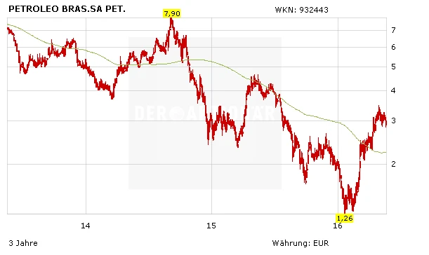 Petrobras hat zwar mit vielen Problemen zu kämpfen, sieht jedoch allmählich wieder Licht am Ende des Tunnels. Die mit einem KBV von nur 0,5 günstig bewertete Aktie bleibt aber ein heißes Eisen und ist nur für mutige Anleger geeignet (Stopp 2,40 Euro).