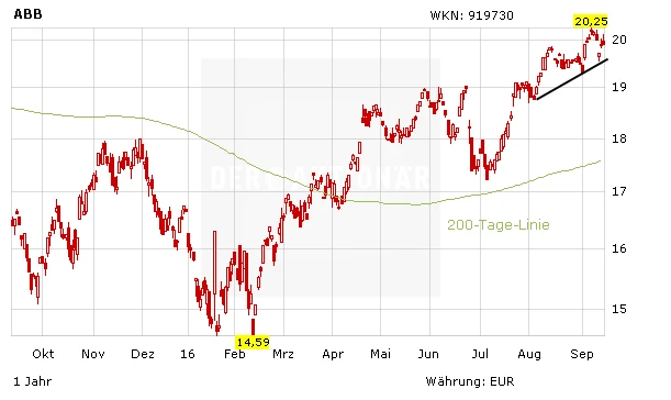 Trotz des Vorstoßes von Großinvestor Cevian Capital bleiben die Papiere vom Elektronikkonzern ABB auf Kurs. Die AKTIONÄR-Empfehlung aus Heft 33/16 liegt bereits knapp vier Prozent im Plus und markierte vor kurzem ein neues Jahreshoch. Außerdem ist die Aktie mit einem KGV von 17 für das kommende Jahr günstig bewertet – fundamental und charttechnisch spricht also nichts gegen einen Einstieg bei ABB.