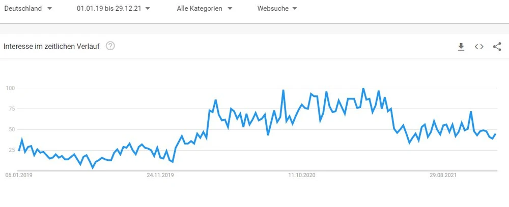 Bereits vor einem Jahr im Lockdown wurde der Kochboxen-Versender HelloFresh regelrecht überrannt und hatte Probleme, genügend Zutaten zu organisieren. Laut Google-Trends-Statistik ist das Interesse nicht mehr so hoch wie noch vor einem Jahr, aber weiterhin auf einem guten Niveau.