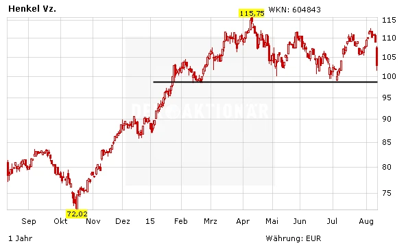 Die Henkel-Vorzüge sind nach den Q2-Resultaten am Mittwochvormittag um mehr als sechs Prozent eingebrochen. Damit nähert sich der Kurs nun wieder der 100-Euro-Marke an, knapp darunter verläuft eine Unterstützungslinie. Fällt diese, droht sich die Situation weiter einzutrüben. Investierte Anleger bleiben aber vorerst dabei.