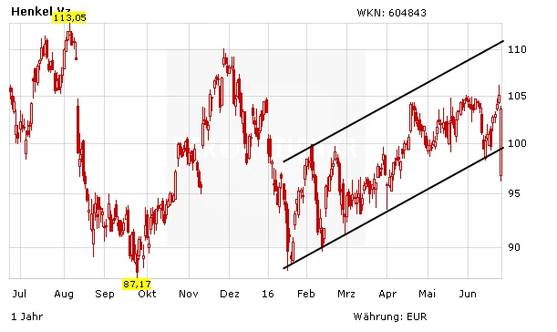Mit den heutigen Neuigkeiten hätte Henkel den steilen Aufwärtstrend, den die Aktie diesen Monat begonnen hat, fortsetzen können. Der Brexit machte dem einen Strich durch die Rechnung. Zu Börsenbeginn wurde sie bis auf ein Tief von 96,25 Euro mitgerissen – ein Minus von knapp acht Prozent. Der langfristige Aufwärtstrend wurde damit gebrochen. Die Verluste vom Tagesbeginn konnte Henkel aber schnell wettmachen. Innerhalb von drei Stunden schaffte es die Aktie annähernd auf das Vortagesniveau von 104 Euro.
