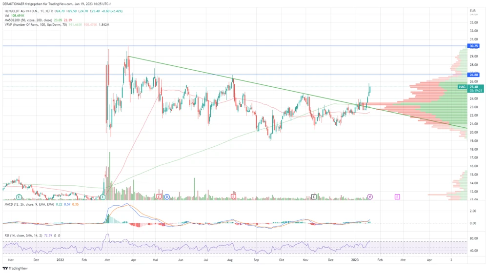 Nun stellt auf dem Weg zu einem neuen Allzeithoch nur noch das August-Hoch bei 26,80 Euro ein ernst zu nehmendes Hindernis dar. Sobald dieses überwunden ist, sollte die Aktie auch das bestehende Allzeithoch bei 30,25 Euro übertreffen können.