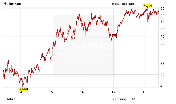 Ohnehin läuft es für das Unternehmen seit Jahren richtig gut: Die Umsätze und Gewinne ziehen stetig an und dürften auch in den kommenden Jahren weiter klettern. Lag etwa Heinekens Umsatz 2014 noch bei 19,3 Milliarden Euro und der Gewinn je Aktie bei 3,05 Euro pro Aktie, dürften die Erlöse 2019 Analystenprognosen zufolge bereits bei 23,5 Milliarden Euro liegen, der Nettogewinn soll auf 4,55 Euro je Anteilschein anziehen.