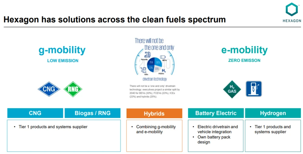 Hexagon Composites sollte allerdings nur temporär auf operativer Seite enttäuscht haben. Denn das Unternehmen bietet eine unfassbar breite Produktpalette für die Antriebe der Zukunft an. Neben Biogas und Wasserstoff möchten die Norweger auch bei der batteriebetriebenen Elektromobilität ein Wörtchen mitreden.