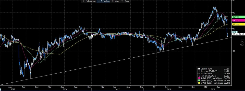 Der Mehrjahreschart der Hexagon-Composites-Aktie zeigt, dass der Kurssturz exakt auf dem langfristigen Aufwärtstrend vorerst beendet wurde. Nun startet der Hot-Stock die überfällige charttechnische Gegenbewegung, die kurzfristig bis an die Marke von 30 Norwegischen Kronen (etwa 3,02 Euro) heranreichen könnte. Anleger mit starken Nerven sollten auf dieses Szenario spekulieren und die Position mit einem Stopp knapp unterhalb des August-Tiefs absichern.