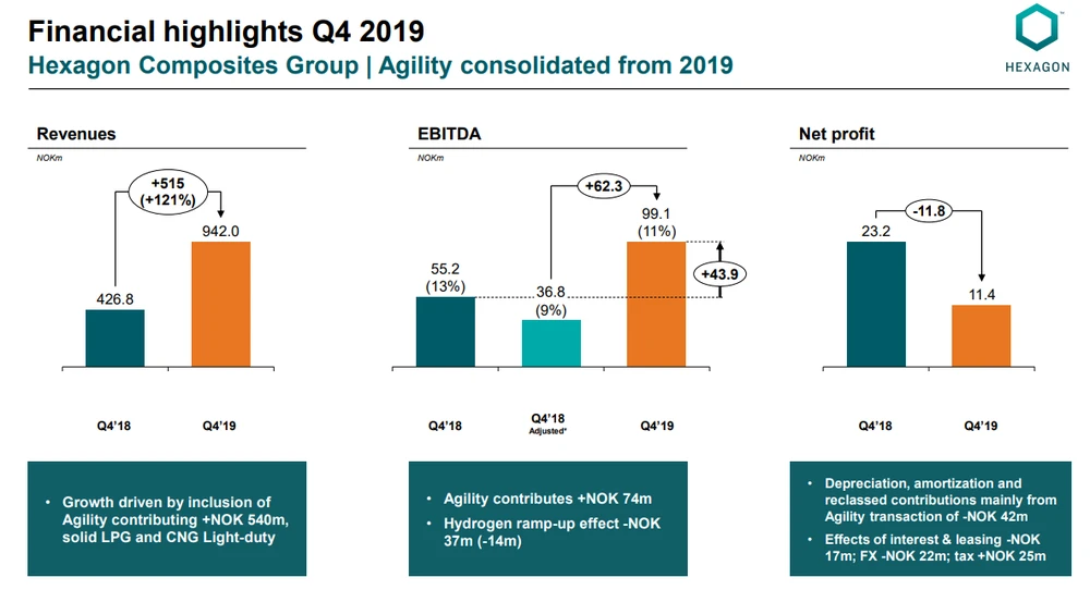 Hexagon Composites hat die Zahlen zum vierten Quartal 2019 veröffentlicht. Dank der Konsolidierung von Agility Fuel Solutions konnten Umsatz und operatives Ergebnis im Berichtszeitraum klar verbessert werden. Belastend wirkt sich nach wie vor das Wasserstoff-Segment auf die Resultate aus der Hexagon-Gruppe aus.