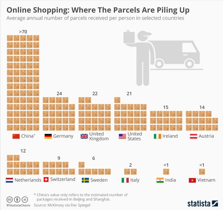 Weit vor Deutschland in Sachen Onlinebestellungen liegt China. Über 70 Pakete ordert der Chinese im Schnitt pro Jahr.