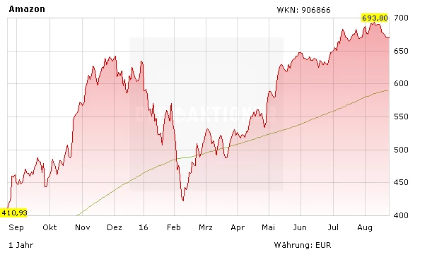 Dass Amazon mittlerweile nicht nur kräftig Umsatz macht, sondern dabei auch noch verdient, haben die jüngsten Quartalszahlen gezeigt. Im Jahresvergleich kletterte der Gewinn von 92 auf 857 Millionen Dollar und hat sich damit mehr als verneunfacht! Nachdem die Amazon-Aktie ein neues Allzeithoch bei 698 Euro markiert hatte, befindet sich in einer durchaus wünschenswerten Konsolidierung. Wer noch nicht dabei ist: Der Einstieg lohnt sich, denn: Hier spielt die Musik!