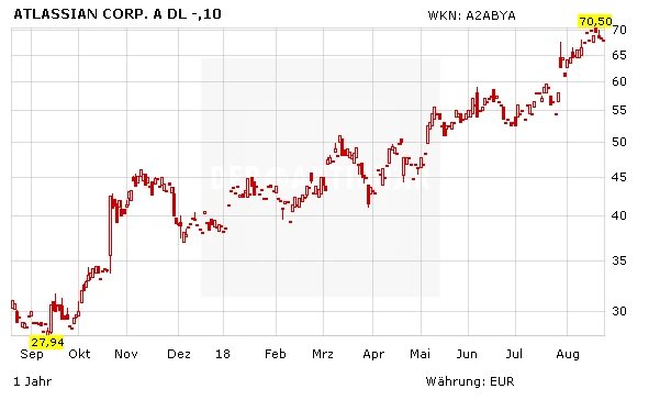 Der Konzern stammt eigentlich aus Sydney, wurde jedoch im Zuge des Börsengangs an der Nasdaq nach London verlegt. Alleine in diesem Jahr legte der Kurs von Atlassian eine unglaubliche Rallye hin. Das Jahresplus notiert weit über 50 Prozent.