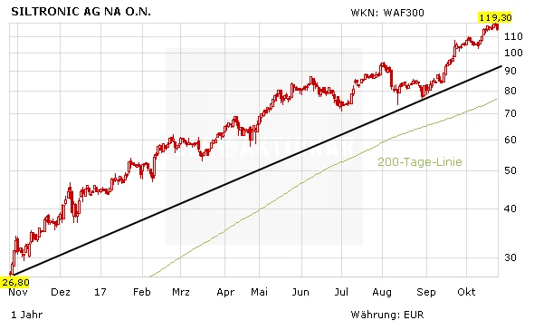 Es ist schon erstaunlich, welche operative Entwicklung Siltronic in den vergangenen Monaten genommen hat. Die Vervielfachung des Aktienkurses ist mehr als gerechtfertigt und dürfte sich fortsetzen. Denn mit einem Kurs-Gewinn-Verhältnis von 12 für 2018 keineswegs zu teuer. Im vergangenen Quartal kletterten die Umsätze um neun Prozent, bei einer EBITDA-Marge von satten 35 Prozent, das EBITDA stieg sogar um 46 Prozent im Vergleich zum Vorjahresquartal.