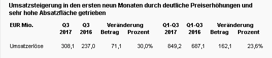 Mit 31 Prozent ist Wacker Chemie weiter größter Anteilseigner von Siltronic und profitiert von der brachialen Kursentwicklung der letzten Monate. Der MDAX-Konzern steigerte im dritten Quartal die Erlöse um 14 Prozent auf 1,31 Milliarden Euro, das EBITDA kletterte um 13 Prozent auf 298 Millionen Euro. Für das Gesamtjahr hebt Wacker Chemie (auch durch die starke Entwicklung von Siltronic) die Prognose erneut an.