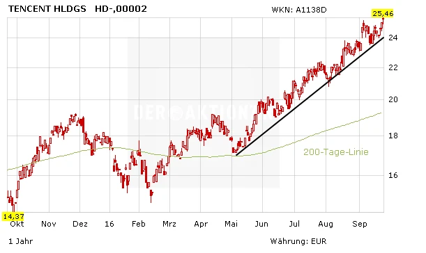 WeChat gehört zu Tencent und hilft dem IT-Giganten seine größte Umsatzquelle zu vertreiben: Mobile Games. Für 2017 erwartet man ein Umsatzplus von 32 Prozent und auch die Gewinne sollen um 29 Prozent steigen. Zudem wird Tencent von 93 Prozent aller Analysten mit einem „Kaufen“ bewertet. DER AKTIONÄR empfiehlt ebenfalls einen Kauf Aktie, die mit einem KGV von 30 für das nächste Jahr bewertet wird. Kursziel 33 Euro.