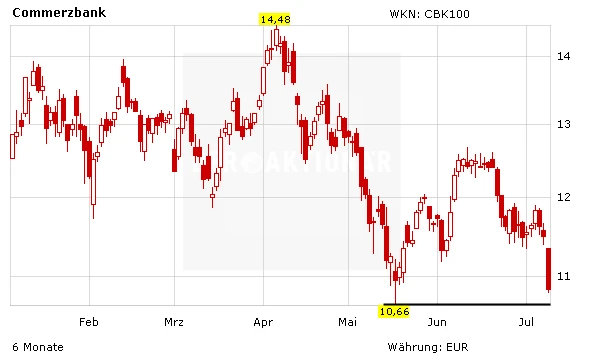 War Anfang Juni noch ein Aufbäumen bei der Aktie der Commerzbank zu sehen, musste das Papier mittlerweile sämtliche Gewinne wieder abgeben. Am heutigen Dienstag ist das Papier sogar der absolute Tagesverlierer im DAX. Die Commerzbank verlor 5,6 Prozent auf 10,85 Euro. Damit rückt nun wieder die wichtige Unterstützung in Form des Maitiefs 2014 bei 10,66 Euro in den Fokus. Händler verwiesen auf einen Pressebericht über Verhandlungen der Commerzbank mit der US-Justiz bezüglich möglicher Strafzahlungen. Dabei gehe es um Verstöße gegen Handelssanktionen bei Geschäften mit dem Iran. Eine Kaufempfehlung der australischen Investmentbank Macquarie verpuffte vollkommen.