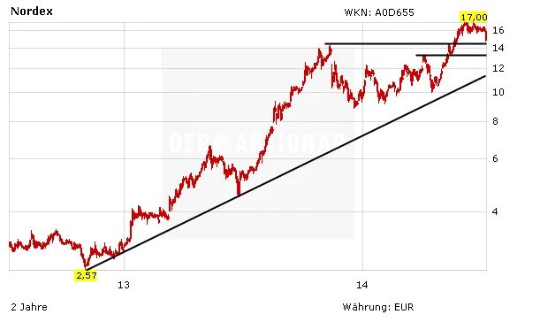 Noch etwas stärker verlor die Highflyer-Aktie Nordex. Das Papier verzeichnete ein Minus von 6,2 Prozent auf 14,90 Euro und ist damit größter TecDAX-Verlierer. Nach der fulminanten Rallye in den vergangenen Monaten setzten hier Gewinnmitnahmen ein. Im Bereich von 14 Euro trifft Nordex aber auf eine wichtige Unterstützungszone.