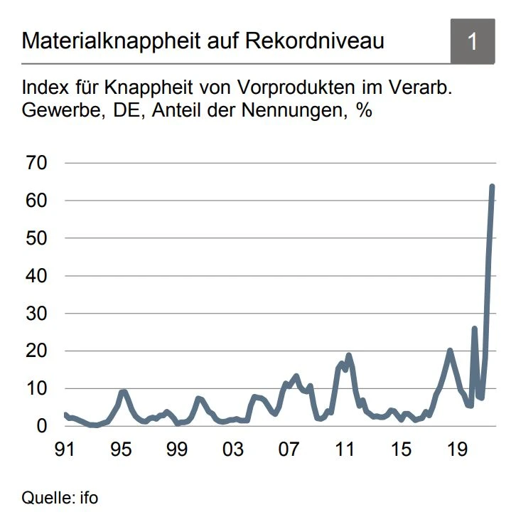 Zu Beginn des dritten Quartals hätten demnach 63,8 Prozent der Firmen über Engpässe berichtet. Das sei eine „historische Dimension“. Prominentestes Beispiel sei die Automobilindustrie. Im August klagten 91 Prozent aller Unternehmen aus der Branche (inklusive Zulieferer) über Knappheit. Auch in der Elektrotechnik, dem Maschinenbau, der Gummi- und Kunststoffindustrie oder in der Möbelindustrie liege der Anteil der Unternehmen mit Materialengpässen jeweils über 80 Prozent.