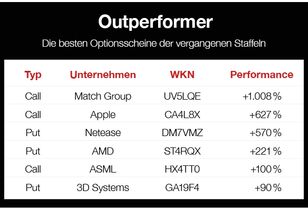 Diese Strategie ermöglicht extrem hohe Gewinne – wie die Top-Outperformer der bisherigen Runden zeigen. In Staffel 1 machten Trader zum Beispiel mit dem Optionsschein auf Match Group 1.000 Prozent Gewinn – innerhalb von nur acht Wochen!