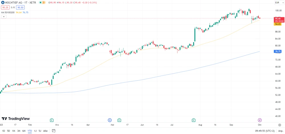 Die Hochtief-Aktie hat im September in Folge der Gewinnmitnahmen die Unterstützung bei 93,80 Euro, sowie die 50-Tage-Linie bei 92,73 Euro erfolgreich getestet. Auf die 50 Tage-Linie, welche mittlerweile bei 94,35 Euro verläuft, war bereits das ganze Jahr über Verlass. Seit dem Test hat das Papier wieder drei Prozent zugelegt.