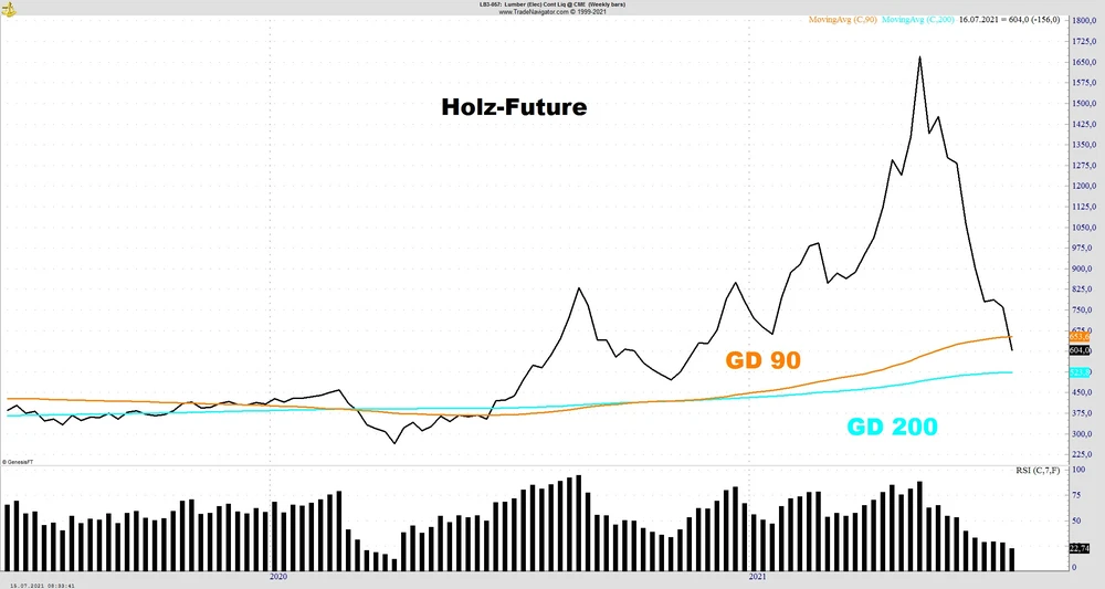 In den letzten zwei Monaten dann das gegenteilige Bild. Der Holz-Future markierte sein Hoch am 10. Mai bei 1.733,50 Dollar, danach kam es zu einem dramatischen Kurseinbruch um mehr als fünfzig Prozent in wenigen Wochen. Doch trotz des enormen Preisverfalls an den Rohstoffmärkten liegen die Kosten für Holz immer noch rund 80 Prozent über dem Niveau vor Ausbruch der Pandemie.