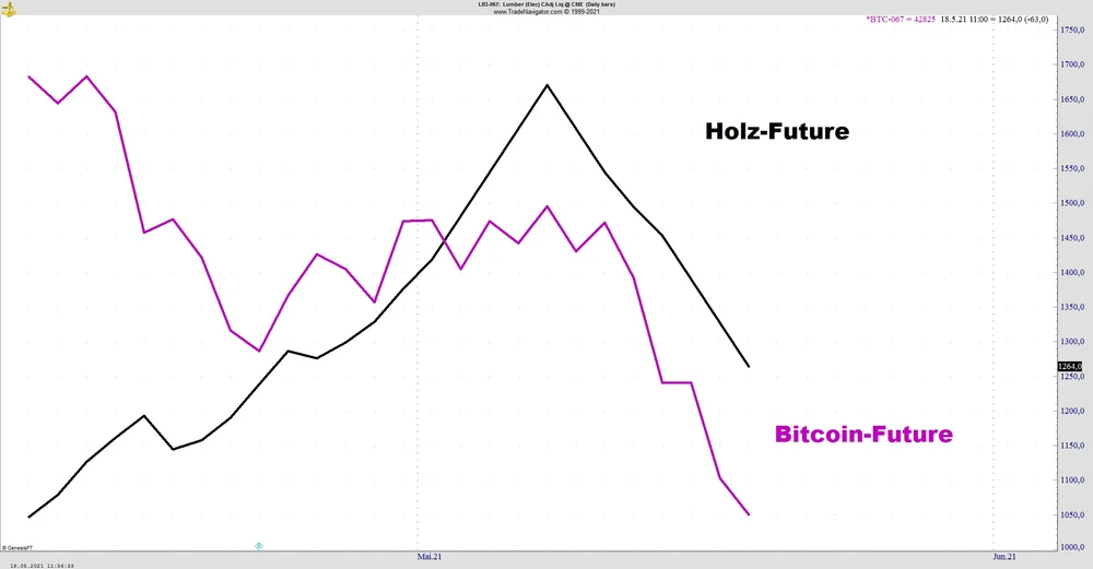 Solche extremen Kursschwankungen sind für Rohstoff-Futures ungewöhnlich und sind eher in den volatilen Crypto-Währungen anzutreffen, was uns zu einem interessanten Vergleich bringt. Die Übereinstimmung der letzten 7 Handelstage des Bitcoin-Futures mit dem des Holz-Futures verzeichnen einen sehr ähnlichen Verlauf, beide Kontrakte haben mehr als ein Viertel ihres Wertes eingebüßt und sind durch wichtige Unterstützungslinien gebrochen.