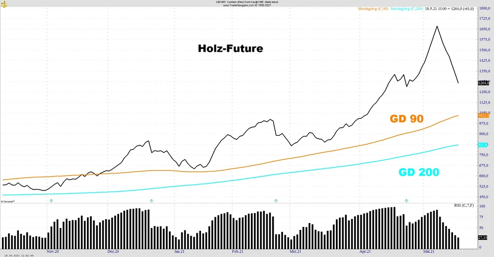Am Montag, 10. Mai eröffnete der Holz-Juli Kontrakt noch mit einem Gap-up und markierte im frühen Handel ein neues Rekordhoch bei 1.733,50 Dollar, gab aber im Handelserlauf die Gewinne wieder ab und schloss auf Tagestief bei 1.607,50 Dollar. Seitdem kennt der Future nur noch eine Richtung und handelte am Dienstag, 18. Mai kurz nach dem Opening wieder Limit down bei 1.264 Dollar, einem Minus von über 27 Prozent.